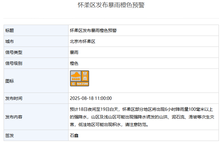 十大实盘配资平台 北京市怀柔区发布暴雨橙色预警
